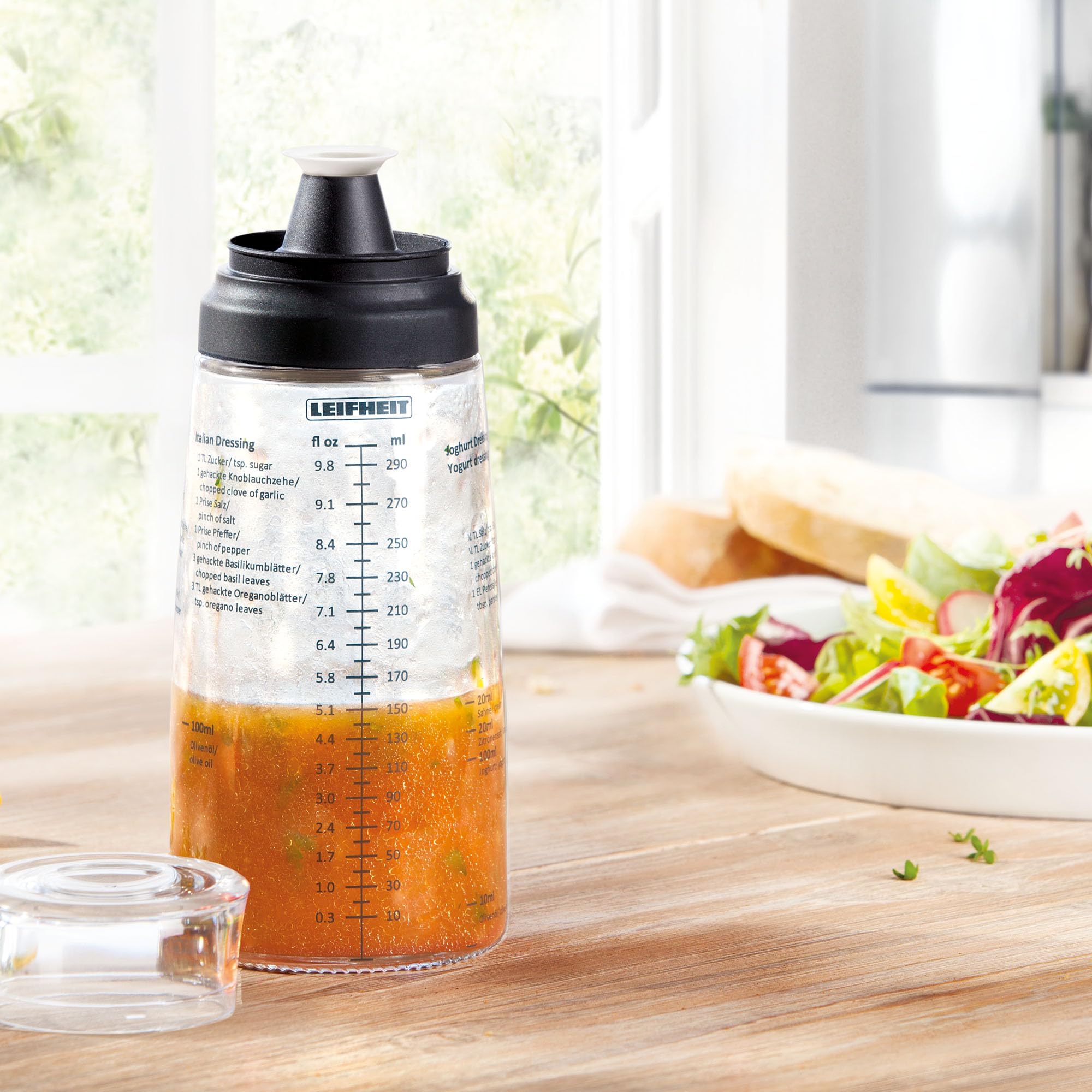 Leifheit Glass Salad Dressing Bottle 10 oz – Durable Eco-Friendly Glass with Leakproof Plastic Lid, Non-Drip Spout, Built-In Recipe Guide, Dishwasher Safe, German Design – Black
